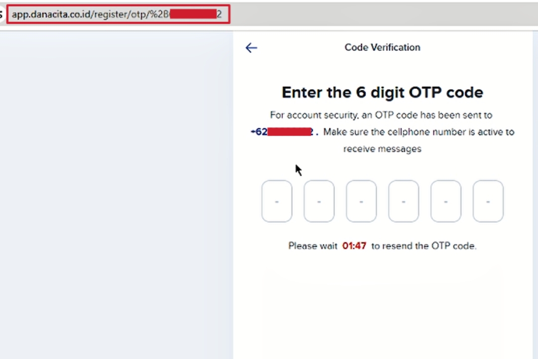 - Step Visit https://app.danacita.co.id/register and enter email, random phone no. and random password. You will be then redirected to OTP screen.