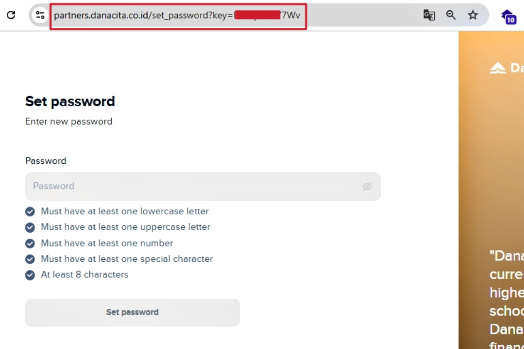 - Step You will receive a password reset token to change/add password for that email and to gain access into partners.danacita.co.id subdomain i.e https://partners.danacita.co.id/set_password?key=R5Z6jHJ83094