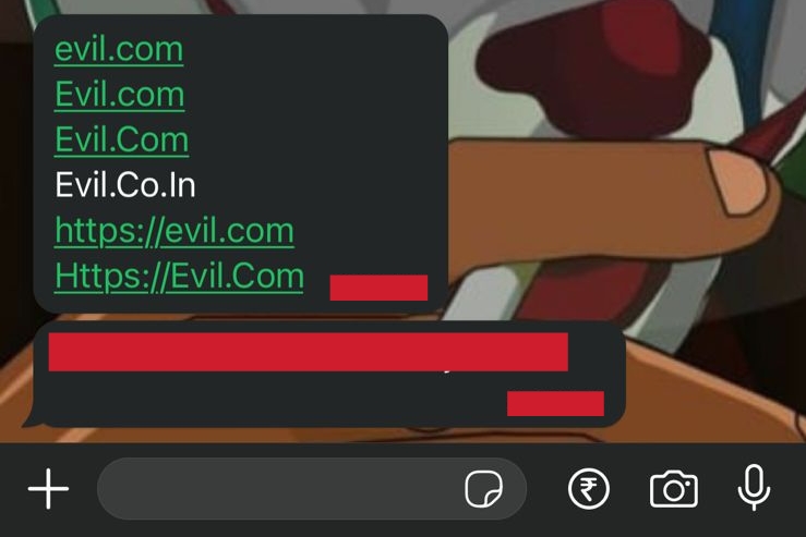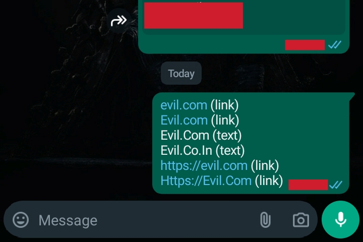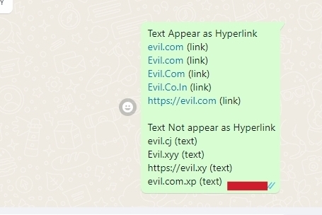 - Whatsapp IOS In IOS Application these three evil.com, Evil.com, Evil.Com will appear as hyperlink and this Evil.Co.In will not appear as hyperlink let me tell you why.