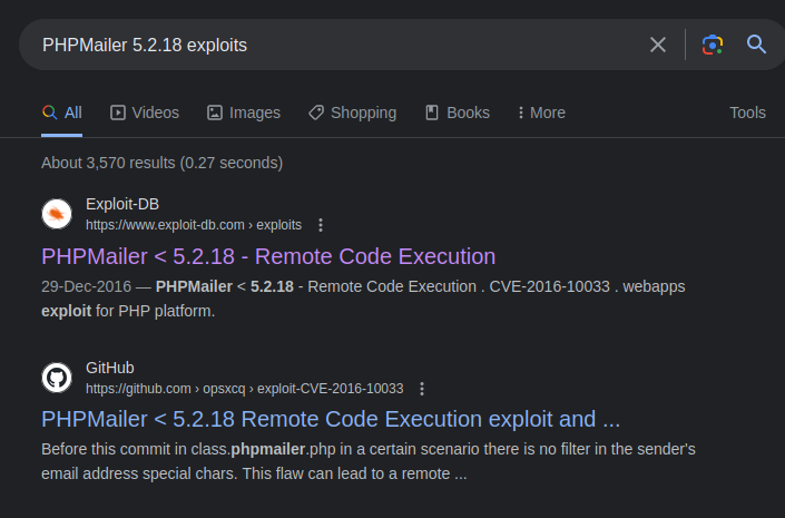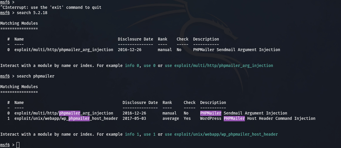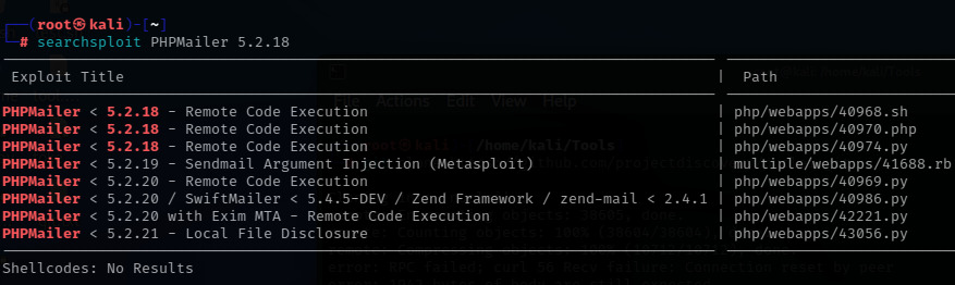 - After finding the versions from any source, for example you have discovered the PHPMailer 5.2.18 from the comment in http or other source. Now, you can go to searchsploit, exploit-db, metasploit, for search exploits or just simply google it like "PHPMailer 5.2.18 exploits".